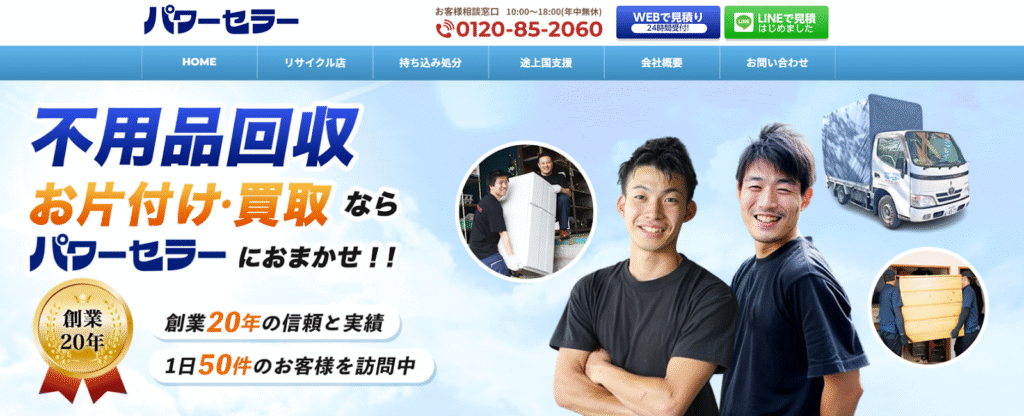 創業20年以上の実績を誇る「不用品回収のパワーセラー」は、東京・埼玉・千葉・神奈川エリアで不用品や粗大ごみの回収、出張買取をリーズナブルに提供する専門業者です。料金表をサイト上に明示し、電話・メール・LINEで簡単に見積もりを確認できる透明性の高いサービスを展開。