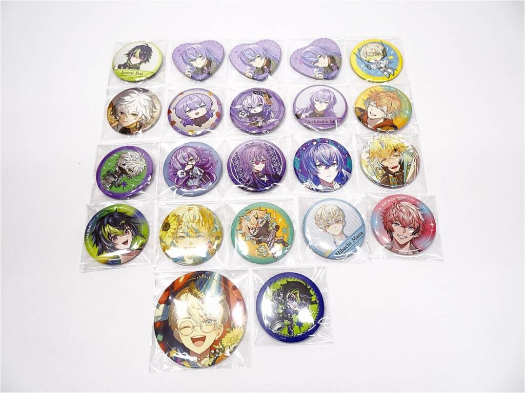 HEROES集合デザインの缶バッジや、複数ライバーを含むセット品も買取対象です。